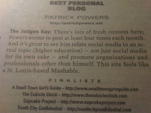 Many of you may have seen me discuss the 1st ever RFT Web Awards which were announced last week. I was a finalist for the awards for Best Personal Blog— and the nomination of myself and others in many different niches in the realm of St. Louis blogging culminated in an awards fete which held last night at Firebird.